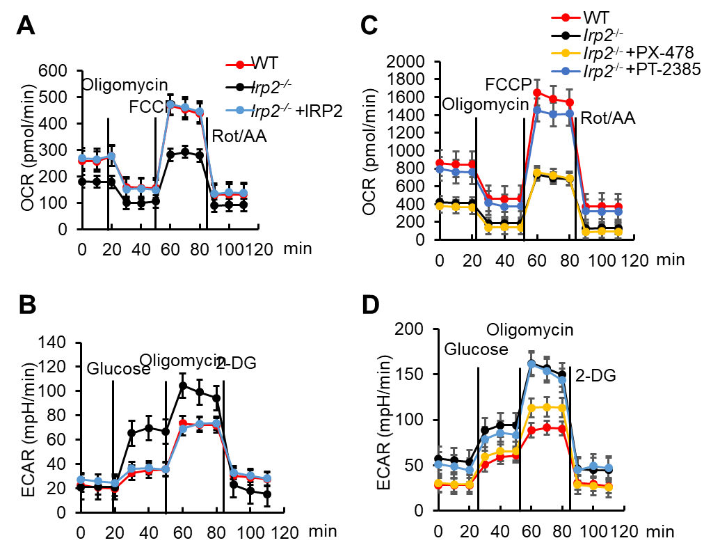 图C-D: IRP2敲除后,抑制HIF1(PX-478)仅抑制了有氧糖酵解,抑制HIF2(PT-2385)仅仅恢复依赖线粒体的氧化磷酸化。