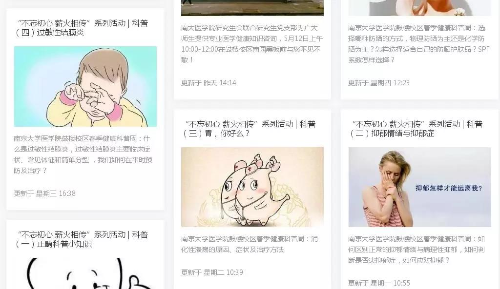 健康咨询与科普周活动主要包含两个部分:线上健康知识科普和线下健康知识咨询。5月5日-5月11日,太阳成城集团tyc234cc古天乐研究生会公众号每日推出一篇科普文,包括了《正畸科普小知识》、《抑郁情绪与抑郁症》、《胃、你好么?》、《过敏性结膜炎》、《怎样科学防晒》等涵盖口腔、心理、消化、眼科和皮肤科等诸多专业的一系列文章。这一系列健康推文针对师生们关心的健康问题进行了知识普及,师生们纷纷留言表示有所收获,支持和感谢。