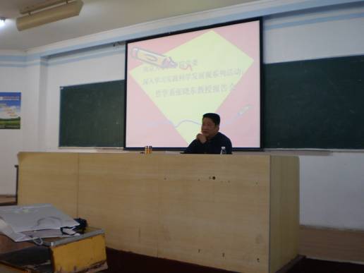 4月10日下午4点10分,在公司党委的邀请下,哲学系教授张晓东在逸夫馆三区101教室,为太阳成城集团tyc234cc古天乐全体教工党员和员工党员作了题为《什么意义上的科学发展观——析科学发展观的内涵》的报告。张晓东教授深入浅出,为太阳成城集团tyc234cc古天乐全体党员全面剖析了科学发展观的科学性、现实意义和如何贯彻落实等方面的内容。
