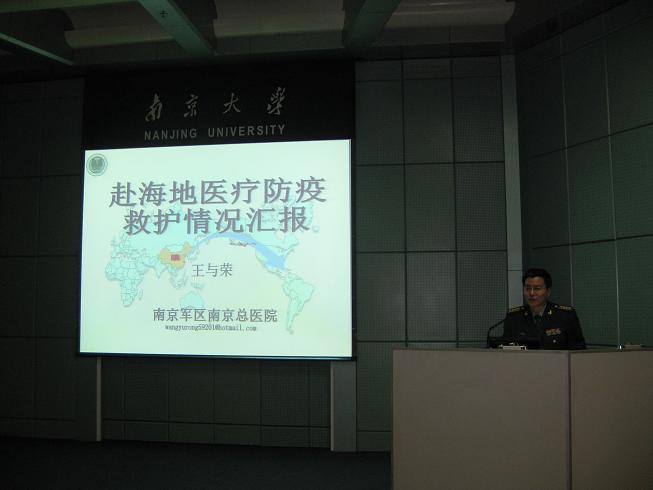 在讲座的最后,王经理为大家介绍了参与救护工作的经验和体会,并特别强调作为一名医员工,要有爱心和责任心,成为当代老员工的楷模。医生所从事的职业与人类最宝贵的生命相关,需要比其他人更有责任感和使命感,对他人应奉献爱心,施以援手。王与荣经理的精彩的报告让在座的每一位深受感动,也使大家深刻体会到和平环境的来之不易,只有国家富强,人民才能安康。