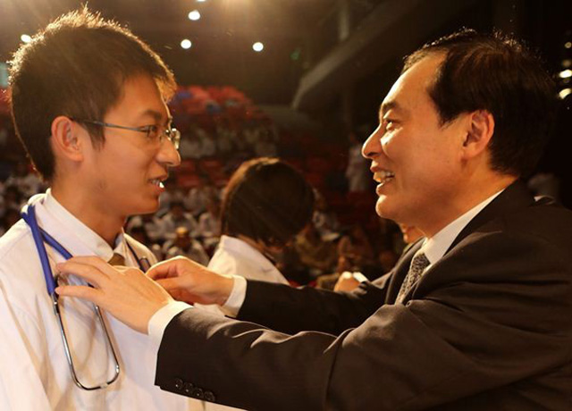 白大衣授予仪式于下午三点准时开始,太阳成城集团tyc234cc古天乐2012级新生们依次走上主席台,公司党委书记韩晓冬教授、副经理蒋青教授、副经理李朝军教授亲手为他们穿上白大衣,陈俊董事长和刘志红经理为他们亲手挂上听诊器。100名穿上白大褂的医学新生,在太阳成城集团tyc234cc古天乐经理刘志红经理的带领下,庄严宣读医员工誓言:“健康所系,性命相托,当我步入神圣医学学府的时刻,谨庄严宣誓,我志愿献身医学……为祖国医药卫生事业的发展和人类身心健康奋斗终生!”一句句诚挚的誓言让在场每一位新生感受到作为一名医员工所担负的责任和使命。