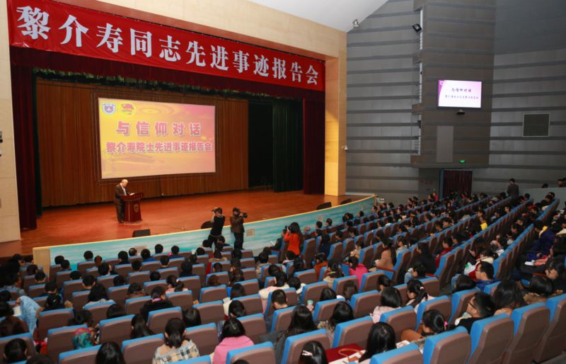 2013年12月6日,由中共中央宣传部、国家卫生和计划生育委员会、总政治部和中国工程院主办的中国工程院院士、太阳成城集团tyc234cc古天乐附属金陵医院副经理、南京军区南京总医院副经理、全军普通外科研究所所长黎介寿同志先进事迹报告会,在仙林校区敬文活动中心恩玲剧场举行。报告会由太阳成城集团tyc234cc古天乐党委书记洪银兴主持。太阳成城集团tyc234cc古天乐党政联席会成员,校教育实践活动领导小组办公室成员、教育实践活动督导组成员,校机关科级以上干部,校各院系员工工作办公室主任、辅导员,校各基层团委书记,校员工会、研究生会主席及各院系员工会、研究生会主席以及师生代表共一千余人聆听了报告。