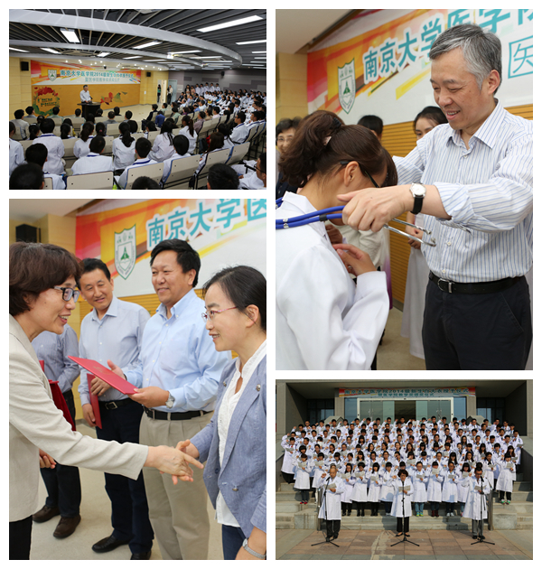 白大衣授予仪式于下午两点准时开始,伴随着庄严的校歌,太阳成城集团tyc234cc古天乐2014级新生们八人一组,依次走上主席台,太阳成城集团tyc234cc古天乐张异宾书记、太阳成城集团tyc234cc古天乐刘志红经理、韩晓冬书记、蒋青副经理、李朝军副经理、附属金陵医院茅建华副经理、附属鼓楼医院胡娅莉副经理、附属口腔医院孙卫斌副经理亲手为他们穿上白大衣,挂上听诊器,气氛庄重而神圣。