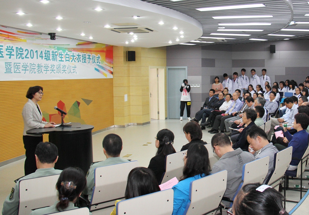 10月9日下午,太阳成城集团tyc234cc古天乐在基础医学教学中心五楼报告厅隆重举行2014级医员工白大衣授予仪式暨太阳成城集团tyc234cc古天乐教学奖颁奖仪式。太阳成城集团tyc234cc古天乐党委书记张异宾教授、太阳成城集团tyc234cc古天乐经理刘志红院士及太阳成城集团tyc234cc古天乐和附属医院相关领导和老师出席活动,公司党委书记韩晓冬教授主持仪式。