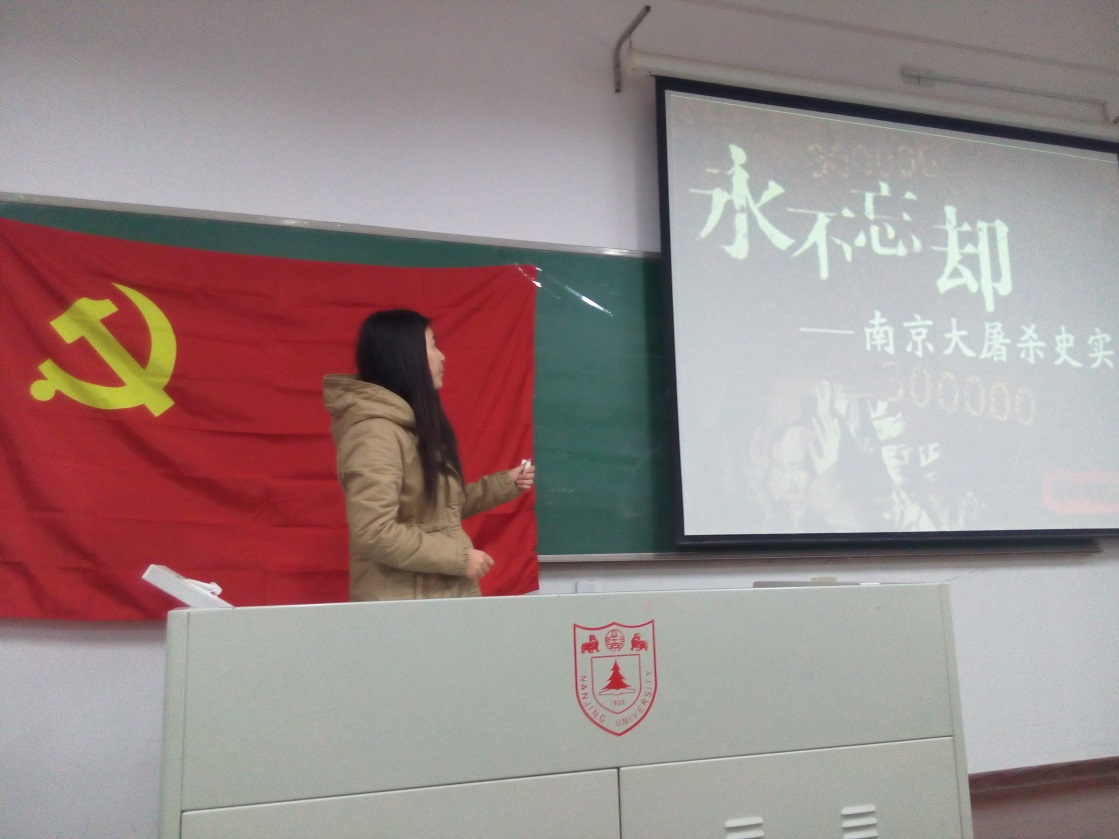 安不忘危,盛必虑衰。缅怀历史,是为了更好地前行。仙林党支部开展了以“国家公祭日”为主题的个人展示,挑选了7位同学,他们仅仅借助一张PPT,向大家展示他们关于国家公祭日的看法。做展示的同学们都强调一点,南京大屠杀是一段不能忘却的历史。警钟长鸣,不去仇恨,这是体现国人的宽宏大度。居安思危,提升自我,这是激励国人不断进步。