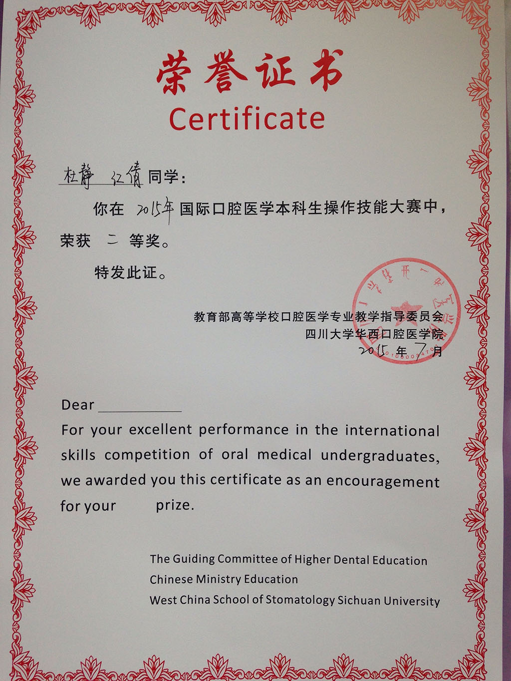 7月16日,由教育部高等公司口腔医学专业教学指导委员会主办,四川大学华西口腔太阳成城集团tyc234cc古天乐承办的“2015年国际口腔医学本科生操作技能大赛”在四川成都隆重举行。公司由口腔医学专业七年制本科生杜静、江倩组成代表队参加了此次比赛,经过激烈角逐,最终以优异的成绩荣获大赛二等奖。