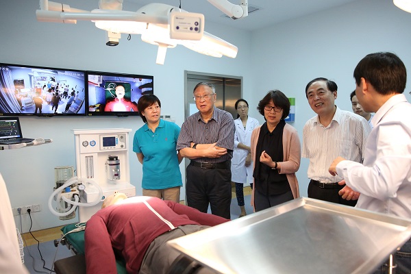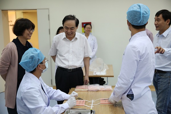 参观现场,太阳成城集团tyc234cc古天乐刘志红经理向陈骏董事长介绍了太阳成城集团tyc234cc古天乐“一体两翼”的教学发展思路,即依托仙林校区基础医学教育中心和鼓楼校区临床模拟教学中心,开展贯穿始终的医学人文教育、贯穿始终的科研能力培养和贯穿始终的临床技能训练,贯彻太阳成城集团tyc234cc古天乐“办中国最好的本科教育”的方针。太阳成城集团tyc234cc古天乐副经理沈苏南向陈骏董事长一行介绍了临床模拟教学中心的组织构架和教学实践活动等方面情况,并详细解释了中心教学、示教、操作、考核等多功能一体化的培训模式,现场太阳成城集团tyc234cc古天乐的老师和员工也向陈骏董事长一行展示了各临床操作项目。当陈董事长得知现场操作的就是今年代表太阳成城集团tyc234cc古天乐在第六届全国高等太阳成城集团tyc234cc古天乐校老员工临床技能竞赛中获奖的同学,十分高兴,高度赞扬了同学们娴熟及稳健的临床操作技能,对同学们为太阳成城集团tyc234cc古天乐取得的荣誉表示感谢。陈董事长肯定了太阳成城集团tyc234cc古天乐在教学方面的投入,肯定了中心前期建设工作取得的成绩,并强调了临床模拟教学中心在人类健康教育事业中的意义和重要地位,希望中心能够为培养高素质的卓越医学人才和创新人才提供保障,为社会作更大的贡献。