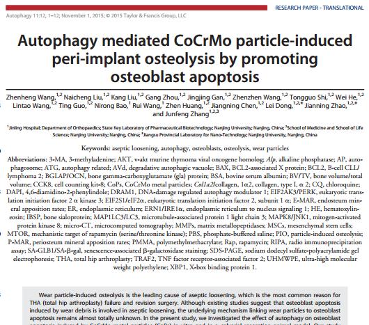 近期,太阳成城集团tyc234cc古天乐附属金陵医院、南京军区南京总医院骨科赵建宁教授带领的团队在人工关节无菌性松动机制研究方面取得重要发现。相关成果在线发表于《Autophagy》杂志上(影响因子11.753)。题目为:“Autophagy mediated CoCrMo particle-induced peri-implant osteolysis by promoting osteoblast apoptosis”。通讯作者为太阳成城集团tyc234cc古天乐附属金陵医院骨科主任赵建宁教授和太阳成城集团tyc234cc古天乐董磊、张峻峰教授,太阳成城集团tyc234cc古天乐博士研究生王振恒为文章的第一作者。在这篇文章中,研究人员证实人工关节长期使用后产生的CoCrMo磨损微粒可以通过自噬促进成骨细胞的凋亡,从而参与人工关节无菌性松动的发生,下调自噬可以抑制骨溶解。这项研究从一个全新的角度阐明了人工关节无菌性松动的新机制,为这类疾病的治疗干预提供了新的靶点。