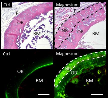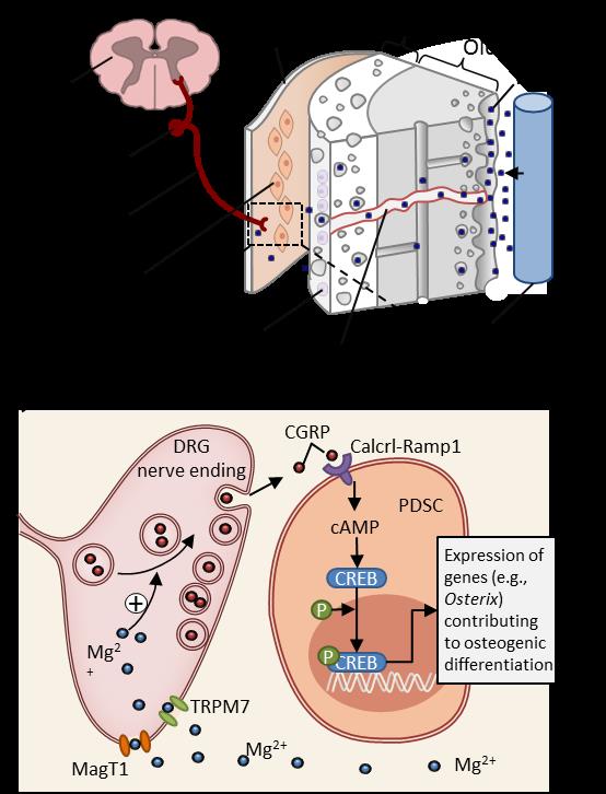 张翼峰等人发现金属镁植入大鼠股骨骨髓腔后,在股骨外周形成大量的新生骨。由于新生骨组织位于骨膜下方,所以研究者推测骨膜组织主导了镁的成骨作用。骨膜组织分布有大量的感觉神经纤维和干细胞,骨膜神经纤维发端于脊髓背根神经节,能够感受温痛觉,释放具有标志性的神经递质降钙素基因相关肽(CGRP)。通过破坏大鼠股骨的感觉神经纤维,以及用基因和药物方式阻断外周神经递质CGRP在骨组织的受体,几种方式共同证明镁金属体内降解产生镁离子在骨膜部位刺激感觉神经末端释放更多的神经递质(主要为CGRP),骨膜内增多的CGRP进一步促进骨膜内干细胞的成骨分化,最后在骨膜部位形成大量的新骨。在体外实验中,研究者发现高于生理浓度的镁离子可以显著提高脊髓背根神经元的突触可塑性(使得神经囊泡大量聚集在突触末梢),该现象是体内镁金属影响感觉神经末端神经递质释放的细胞学基础。