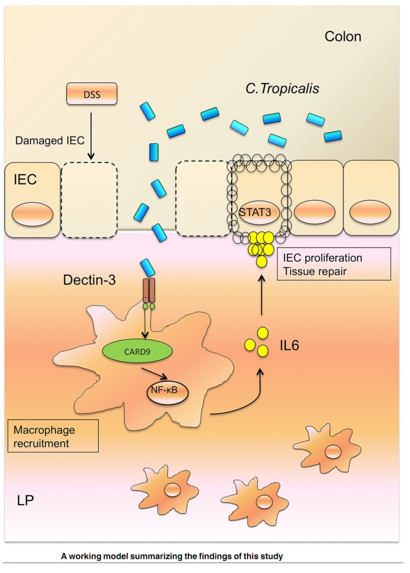本研究首次发现Dectin-3-/-鼠比野生鼠易于罹患急性肠炎,值得关注的是,Dectin-3-/-鼠肠道中真菌的数量,尤其是条件致病真菌C. tropicalis 的数量显著高于正常鼠;Dectin-3-/-鼠在肠炎诱导过程中予 C. tropicalis灌胃可显著加重炎性病变的程度,而给予氟康唑抗真菌治疗后,Dectin-3-/-鼠肠道炎性反应明显改善;进一步发现骨髓来源的固有免疫细胞—巨噬细胞可通过dectin-3识别并吞噬真菌,从而诱导机体的抗真菌免疫应答。本研究还发现Dectin-3-/-鼠中异常的免疫应答参与了肠道上皮细胞的修复和内稳态(图1)。Dectin-3属于C型凝集素样受体(C-type lectin receptors , CLRs)的家族成员,是介导机体抗真菌免疫的一类重要的模式识别受体。该研究证实了Dectin-3介导的抗真菌免疫应答在维持肠道稳态和诱导肠道炎症中的重要作用,阐述了肠道共生真菌在炎症性肠病发病中机制(图2),对于临床相关疾病的诊治具有重要的指导意义。