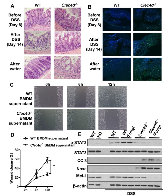 图1. Dectin-3 介导的抗真菌免疫应答参与肠道上皮细胞的修复。A. Clec4d-/-与野生鼠中急性肠炎模型中肠道组织HE染色图;B. Clec4d-/-与野生鼠中真菌荧光染色图;C-D. Clec4d影响了上皮细胞的迁移和修复; E. Clec4d-/-与野生鼠中急性肠炎模型中增殖及凋亡蛋白表达。