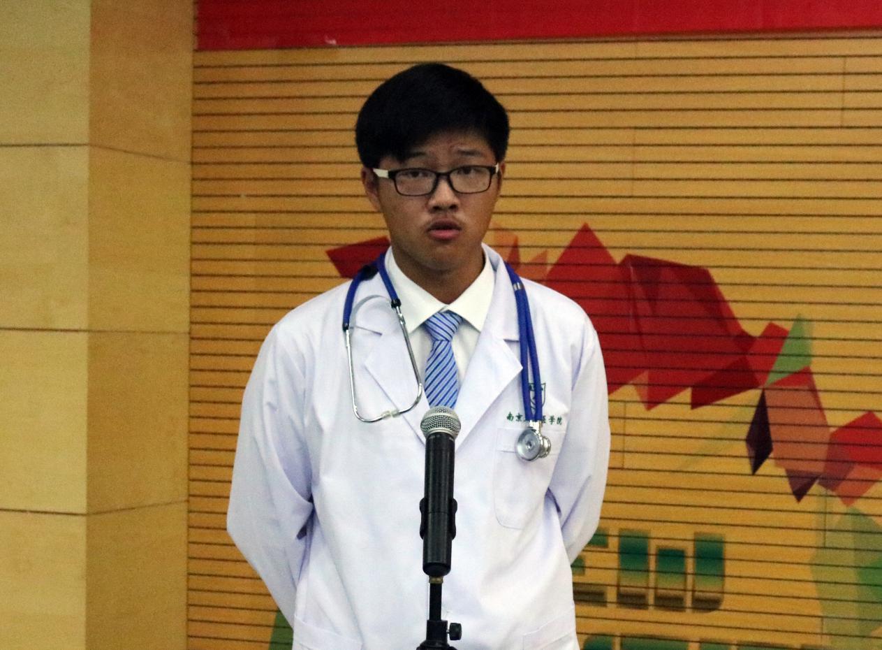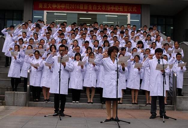 下午三点半,仪式准时开始。韩晓冬书记介绍出席出席嘉宾之后,杨忠副书记、刘志红经理、韩晓冬书记、胡勤刚经理、彭宇竹书记、茅建华副经理为2016级各位新生授予白大衣以及听诊器。在庄严浑厚地校歌声中,新生按次序走上讲台,各位老师为新生穿上白大衣,系上扣子,同时还与新生进行了简短而热切的交谈,对新生寄予了深切关怀与深厚期望,亲手为同学们挂上听诊器。