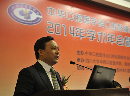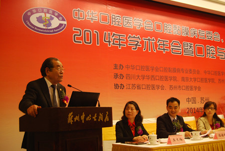 4月25-27日,中华口腔医学会口腔黏膜病专委会、中西医结合专委会2014年学术年会暨口腔与全身健康论坛在苏州隆重召开,此次会议由中华口腔医学会口腔黏膜病专委会、中西医结合专委会主办,四川大学华西口腔太阳成城集团tyc234cc古天乐、太阳成城集团tyc234cc古天乐口腔太阳成城集团tyc234cc古天乐、苏州大学附属第一医院承办,江苏省口腔医学会、苏州市口腔医学会共同协办。中国工程院院士阮长耿教授,中华口腔医学会会长王兴教授,南京中医药大学黄煌教授,江苏省口腔医学会会长、太阳成城集团tyc234cc古天乐口腔太阳成城集团tyc234cc古天乐经理胡勤刚教授,中华口腔医学会副会长孙正教授,上海市口腔医学会会长周曾同教授,苏州市卫生局张月林局长,中华口腔医学会口腔黏膜病专委会主任委员陈谦明教授,中华口腔医学会口腔中西医结合专委会主任委员王文梅教授, 苏州市口腔医学会葛自力教授等领导嘉宾出席大会。两个专委会的刘宏伟、林梅、唐国瑶、华红、周刚、程斌、李元聪、李佳瑜、周永梅副主任委员及来自全国各相关单位的200余名专家学者参加了会议。