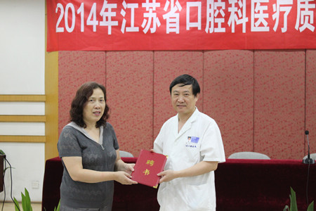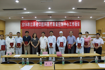 江苏省医院协会医疗质控管理办公室徐明娜主任宣读调整江苏省口腔科质控中心成员批文并颁发证书。江苏省口腔科医疗质量控制中心主任、太阳成城集团tyc234cc古天乐附属口腔医院经理胡勤刚教授通报了上一届江苏省口腔科质控工作情况,并对下一步工作进行了部署。