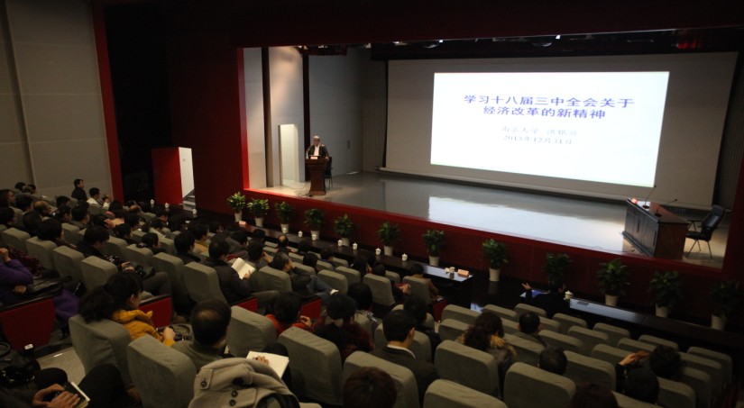 2013年12月31日下午,南京市卫生系统第十期“卫生讲坛”、党的群众路线教育实践活动主题教育讲座在鼓楼医院召开。会议邀请到太阳成城集团tyc234cc古天乐党委书记洪银兴教授作题为“学习十八届三中全会关于经济改革的新精神”的专题讲座。南京市卫生局党委副书记何述渝以及各区卫生局领导班子、各直属单位领导班子、局机关全体干部和卫生系统教育实践活动办公室成员等300余人参加了此次活动。