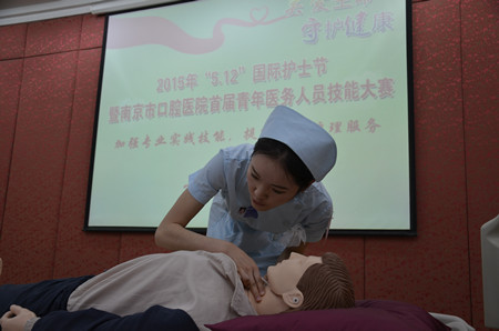 “先生、先生,您怎么啦?”“病人需要救治,马上准备抢救。”赛场不时传来呼声,将在场的每个人一下子带入了抢救病人的紧张气氛中。17名参赛选手在“模拟人”面前评估、呼救、通气、按压...... 一边呼救一边熟练地进行抢救。选手们在紧张激烈的比赛中展现出娴熟的操作技能和扎实过硬的基本功,体现出争分夺秒的急救意识。经过近两个小时紧张、激烈角逐,李婷荣获一等奖,王茹玥、张舒、吉馨璇、黄丽媛荣获二等奖,韦敏、余静姝、陈玉姣、孔露、李秋云、李沐昕、程艳荣获三等奖。