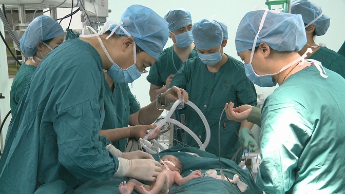 首先由鼓楼医院产科专家王志群和戴毅敏两位主任为罗莉莉进行剖宫产手术。两位经验丰富的主任默契配合,小心翼翼地取出胎儿,保护膨出部位,胎儿毫发无损!断脐后,胎儿即刻进行插管麻醉,转入另一间手术室。早已等候在旁的南京市儿童医院新生儿内科专家周晓玉、徐英美主任医师、新生儿外科徐小群主任医师、唐维兵副主任医师以及NICU经验丰富的护士立即上阵,儿童医院麻醉科主任费建亲自担任手术麻醉师保障术中安全。儿童医院的护士一针见血,在新生儿手上开辟了静脉通路,专家们小心翼翼地剥离掉包裹着肝脏和肠子的囊膜,然后把它们缓缓地放回到孩子的腹腔内,与此同时密切观察腹内压增高带来的新生儿呼吸、循环异常,为减轻腹腔压力,在腹壁缺损的位置放入人工补片进行修补。在多科专家团队的精诚合作下,手术历时一个半小时,终于顺利完成。