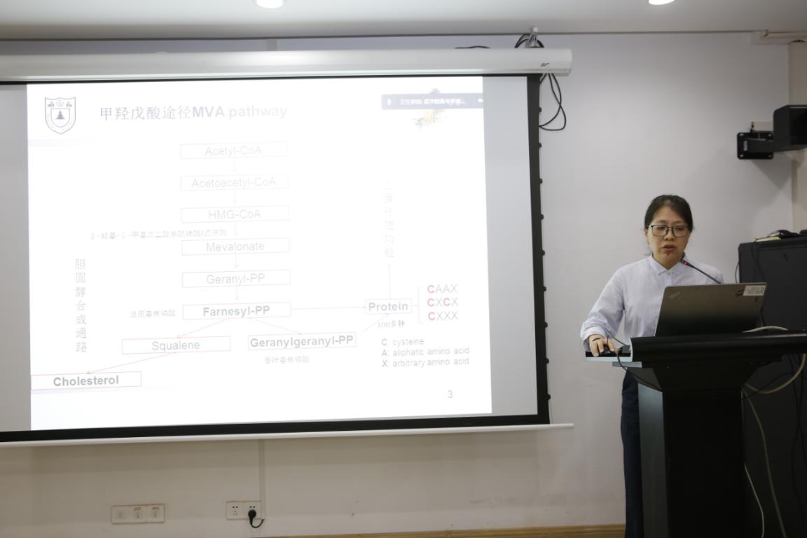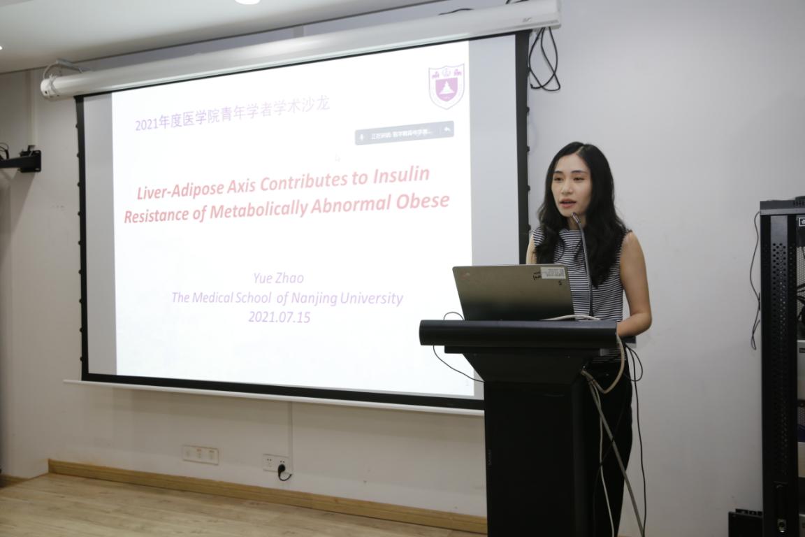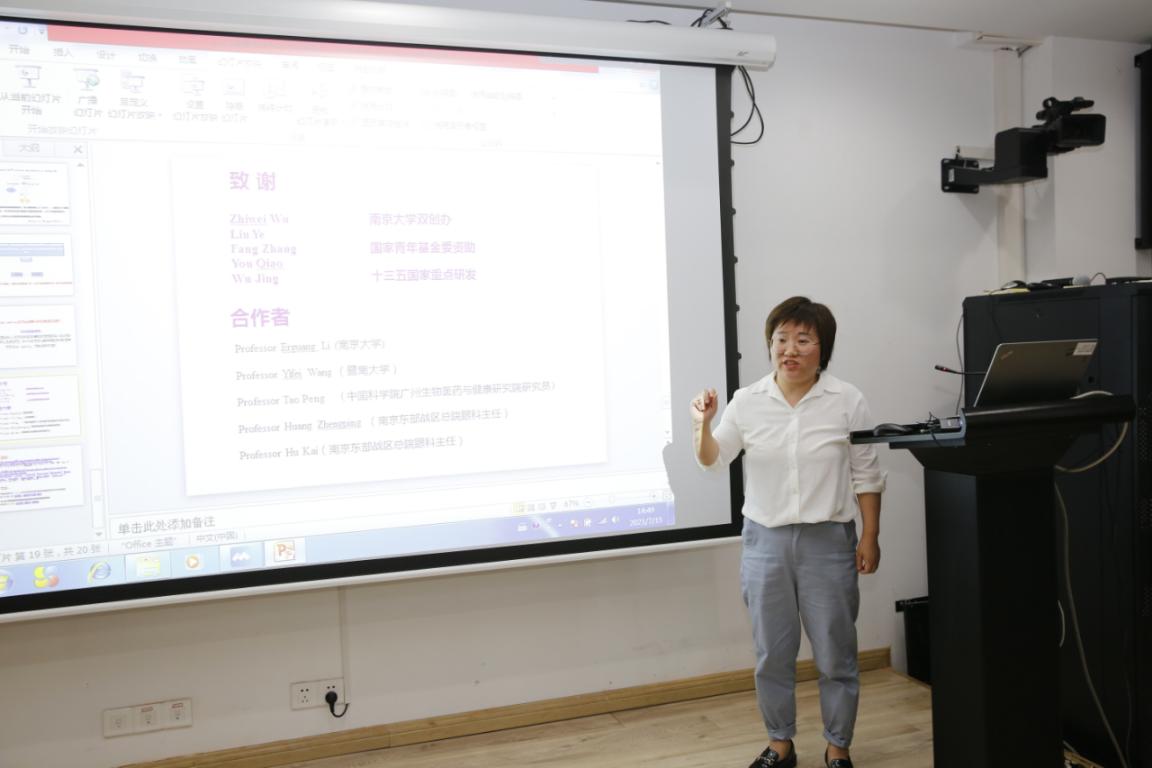 15位参会的青年教师都做了充分的准备,依次上台进行科研工作汇报。赵越老师就她上半年的科研工作成果作了内容丰富的学术汇报,主要围绕肝脏脂肪代谢协同导致肥胖人群代谢功能异常的机制研究这一主题与在场的师生进行交流。