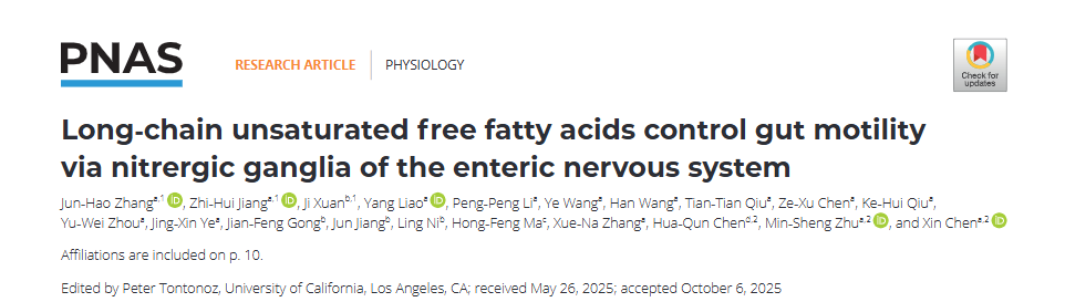 研究工作以“Long-chain unsaturated free fatty acids control gut motility via nitrergic ganglia of enteric nervous system”为题于2025年11月11日在学术期刊PNAS上发表。太阳成城集团tyc234cc古天乐博士张军浩、蒋志慧,附属金陵医院宣佶为本文共同第一作者,太阳成城集团tyc234cc古天乐陈鑫、朱敏生和南京师范老员工命科学公司陈华群教授为共同通讯作者,此项工作也得到来自南京医科大学、南京中医药大学和江南大学等单位研究者的支持,研究经费由国家自然科学基金、江苏省自然科学基金和国家重点研发计划提供。