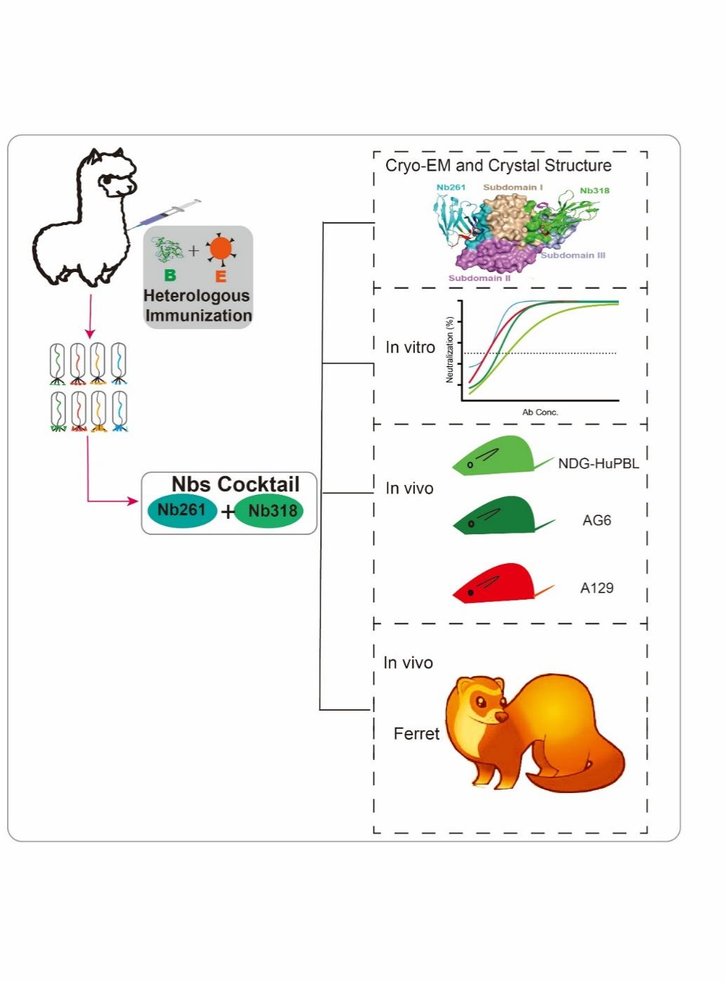 太阳成城集团tyc234cc古天乐吴喜林助理教授团队在长期研究基础上取得重要突破。团队历时 9年,基于此前研发的第一代纳米抗体(Wu et al., JCI Insight 2020)以及建立的SFTSV感染人源化小鼠模型(Xu et al., PLOS Pathogens 2021),通过序贯异源免疫策略,从不同亚型 SFTSV抗原免疫的羊驼中筛选获得了新一代高亲和力、广谱中和单域纳米抗体(包括 Nb71、Nb261、Nb317、Nb318)。结构生物学分析进一步揭示,Nb261和 Nb318分别靶向 SFTSV Gn蛋白上两个高度保守且互不重叠的关键表位,可协同阻断病毒入侵。基于此构建的纳米抗体“鸡尾酒”(Nb261+Nb318)在体外对多亚型 SFTSV实现完全中和,表现出显著的协同抗病毒活性。
