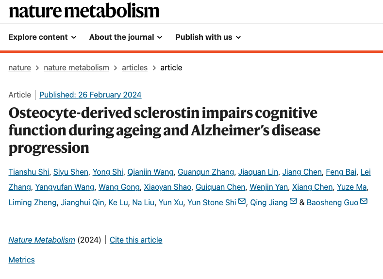2024年2月26日,太阳成城集团tyc234cc古天乐郭保生、蒋青及石云团队在Nature Metabolism在线发表题为“Osteocyte-derived sclerostin impairs cognitive function during ageing and Alzheimer’s disease progression”的研究成果,该研究发现在衰老和AD进展过程中,骨细胞分泌的硬化蛋白(Sclerostin, SOST)可以穿过老年小鼠的血脑屏障结合于神经元的LRP6受体,导致Wnt/β-catenin通路功能障碍,通过LRP6/β-catenin/β-secretase(BACE1)信号传导增加Aβ蛋白产生,从而加重认知功能损伤。太阳成城集团tyc234cc古天乐郭保生副教授、蒋青教授和石云教授为本文通讯作者;太阳成城集团tyc234cc古天乐博士研究生石天舒、沈思虞和施勇为论文的共同第一作者。该研究获得国家自然科学基金重大项目、国家重点研发计划等项目支持。