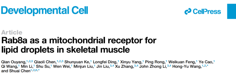 2023年2月16日,太阳成城集团tyc234cc古天乐模式动物研究所的陈帅/王宏宇团队在《Developmental Cell》杂志上发表了题为“Rab8a as a mitochondrial receptor for lipid droplets in skeletal muscle”的研究论文。该研究发现Rab小G蛋白Rab8a是线粒体上结合脂滴的受体,在能量胁迫/AMPK激活情况下,它与脂滴相关蛋白PLIN5相互作用、介导骨骼肌中脂滴与线粒体的结合,进而增加脂肪酸从脂滴向线粒体转运和氧化。太阳成城集团tyc234cc古天乐博士研究生欧阳茜和助理教授陈俏利为该论文的共同第一作者,陈帅教授和王宏宇副教授为本文的共同通讯作者。