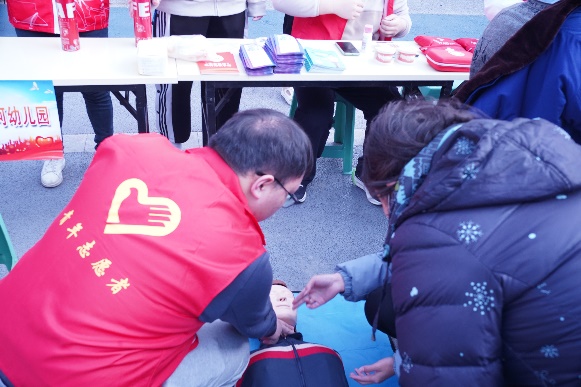 图为3.4日 太阳成城集团tyc234cc古天乐团委南悦青年志愿服务队志愿者在为居民讲解心肺复苏知识
