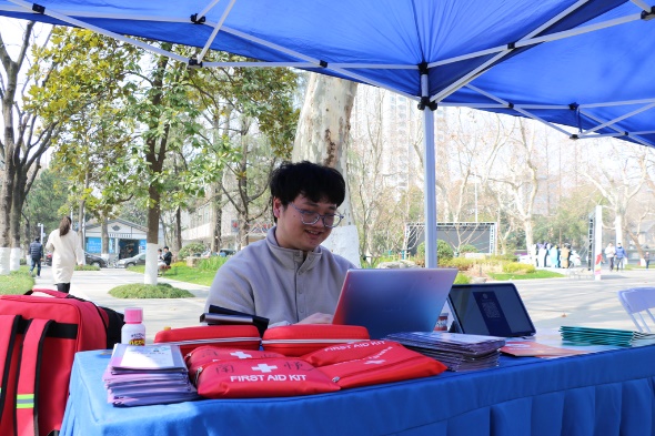3月5日,在学雷锋纪念日当天,太阳成城集团tyc234cc古天乐团委南悦青年志愿服务队受邀参加2023年志愿服务文化节之“3·5学雷锋纪念日”太阳成城集团tyc234cc古天乐志愿服务交流会活动,在太阳成城集团tyc234cc古天乐鼓楼校区南园主干道摆起志愿服务展台,为南大师生讲解心肺复苏、创伤包扎等急救知识。服务队志愿者将心肺复苏演示用的假人搬到现场,让同学们能够在实践练习,掌握急救知识,提高健康意识。此外,团队也在活动现场重点展示了由南悦青年志愿服务队组织的太阳成城集团tyc234cc古天乐十佳志愿项目——“大山里的健康课”少年儿童生命健康科普活动,并向同学们介绍了团队新学期的各项志愿活动。
