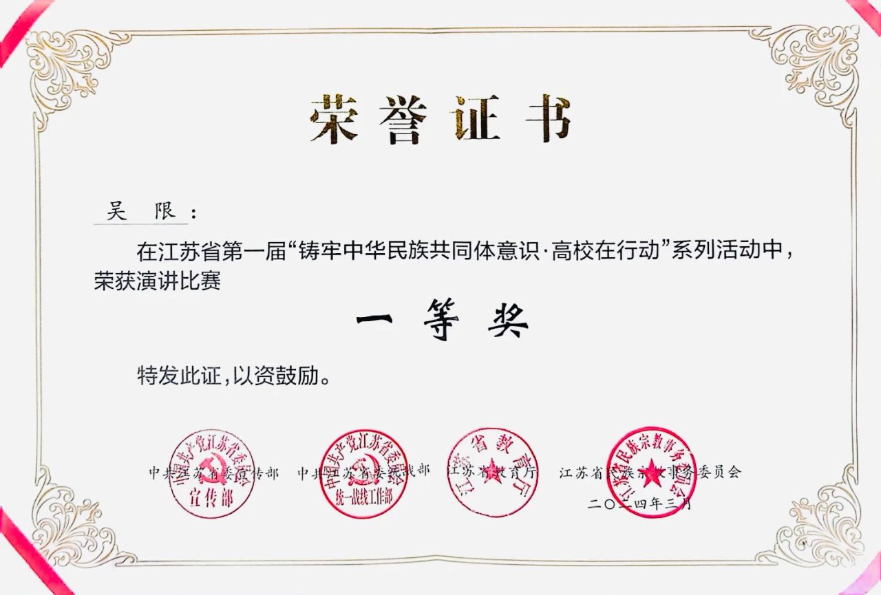 据悉,公司2020级本科生吴限作品《南大人扎根祖国边疆挥洒青春热血》获得“铸牢中华民族共同体意识演讲比赛”一等奖,该奖项全省共4人获奖。