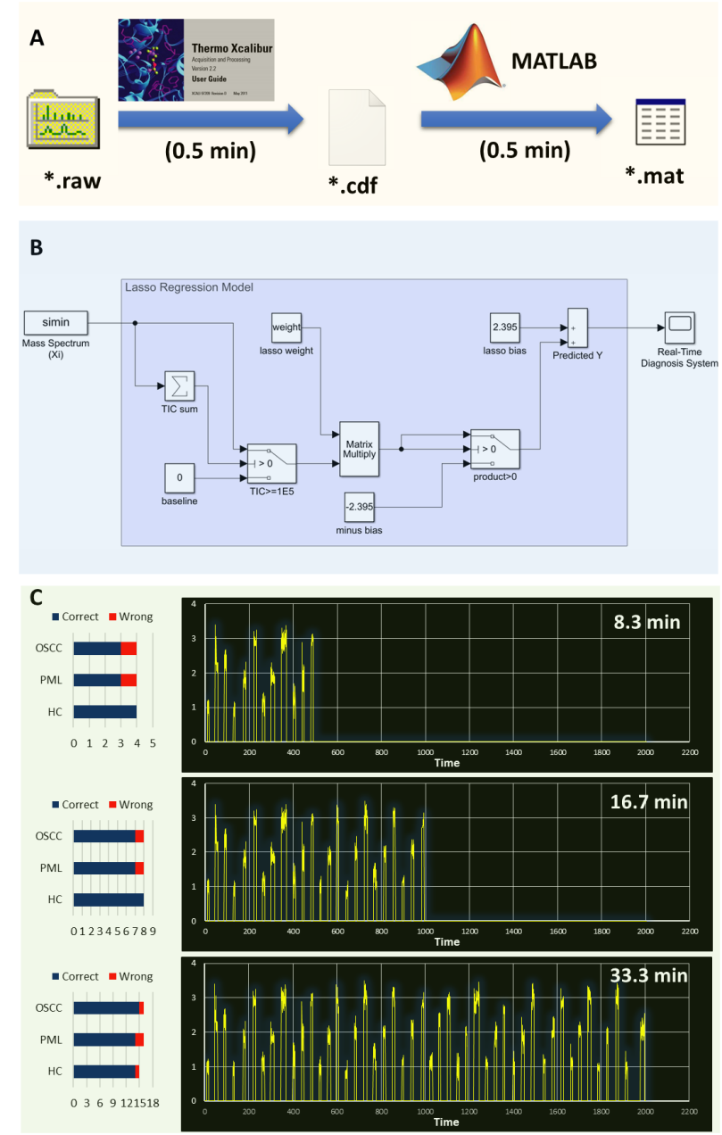 口腔鳞癌是头颈部常见的恶性肿瘤之一,患者5年生存率仅约60%。大多数口腔鳞癌患者就诊时已处于临床中晚期阶段。因此,对口腔鳞癌进行早期诊断,筛查高风险的患者,具有重要的临床意义。胡勤刚教授团队与Richard N. Zare教授团队合作,利用先进的导电聚合物喷雾电离质谱技术(CPSI-MS)对口腔癌、癌前病变、健康志愿者的唾液进行代谢组学分析,并结合人工智能机器学习模型,仅需少量的病人唾液样本,用时不到1分钟即可实现对口腔癌和癌前病变患者进行即时诊断(Point-of-care test)。该方法相比传统的口腔癌手术活检诊断,具有无创、快速、精准等优点,能显著降低患者的经济负担和心理压力,具有良好的临床应用前景。胡勤刚教授团队长期以来坚持以临床问题为导向开展科学研究,聚焦于口腔鳞癌外科安全切缘和口腔鳞癌早期诊断标志物的研究。