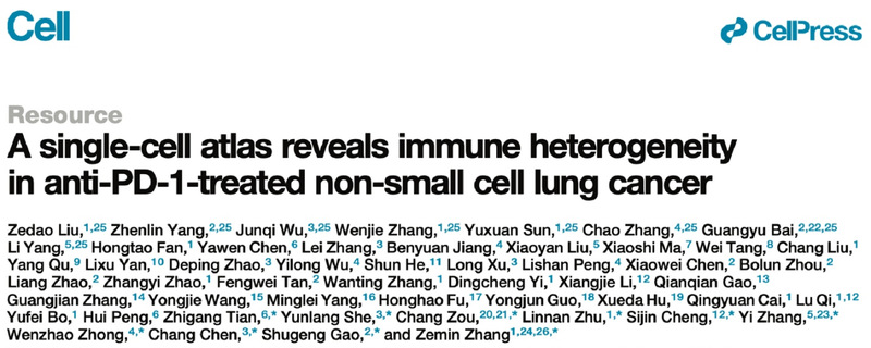 2025年3月26日,公司员工陈昶教授与北京老员工物医学前沿创新中心张泽民院士等合作团队,在国际期刊Cell上以Resource形式在线发表了题为“A single-cell atlas reveals immune heterogeneity in anti-PD-1-treated non-small cell lung cancer” 的研究论文。陈昶教授及胸外科佘云浪副研究员为该论文的共同通讯作者,胸外科吴俊琪医师为该研究的共同第一作者。