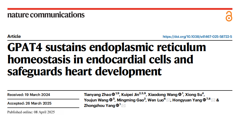 上述研究结果于近期发表于Nature Communications杂志,题目为“GPAT4 sustains endoplasmic reticulum homeostasis in endocardial cells and safeguards heart development”。该研究发现内质网稳态及内质网-线粒体互作对心内膜发育的重要调控作用,在细胞器水平帮助理解心肌致密化不全的发生机理。