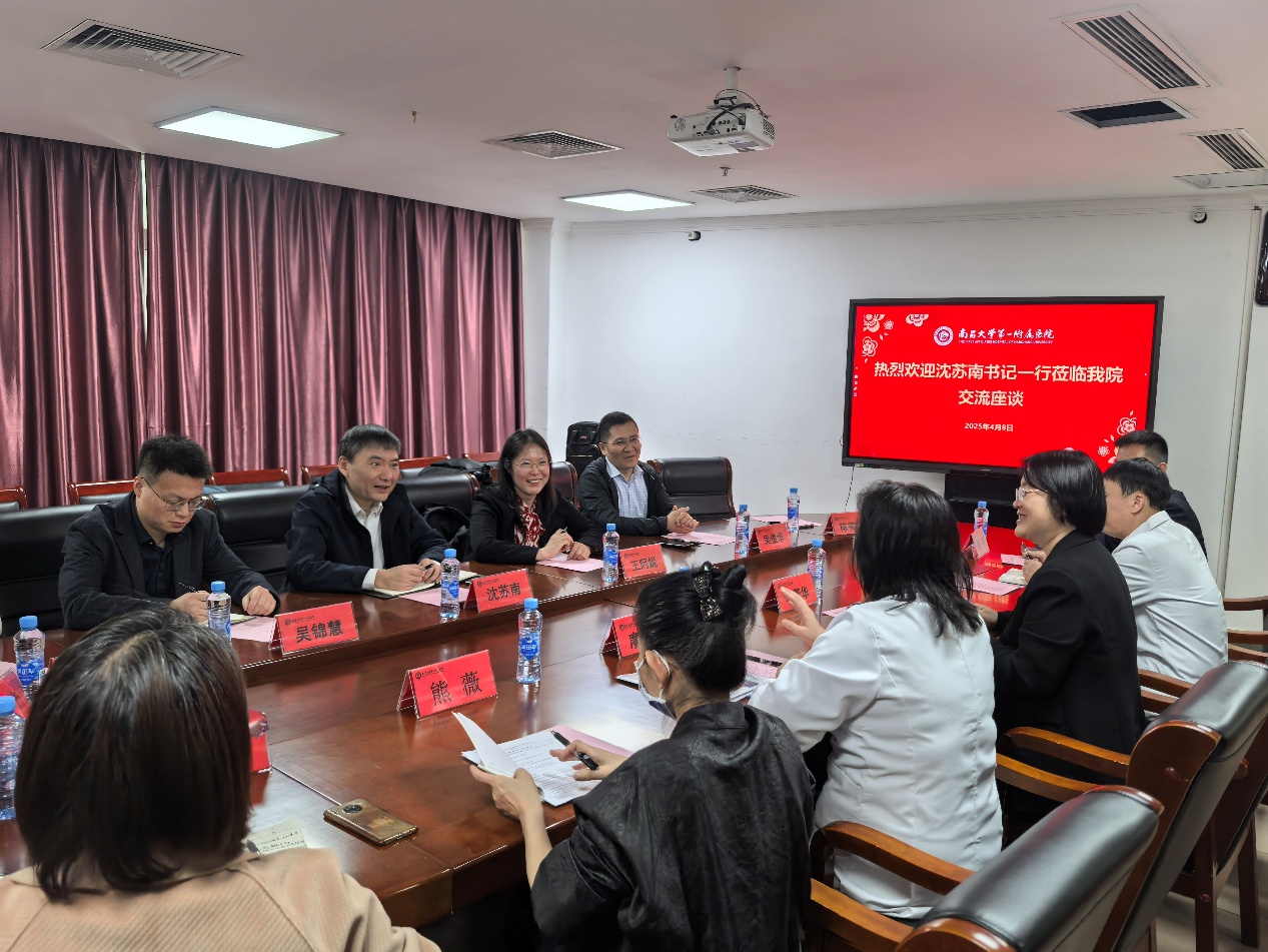 在南昌大学第一附属医院,沈苏南一行受到了医公司党委书记廖岚等院领导的热情接待,双方随即展开了深入的座谈交流。会上,廖岚介绍了医院的发展历程、科研实力、公司产品等方面。她指出,南昌大学第一附属医院是集医疗、教学、科研、预防保健、健康管理与促进于一体的全国首批三级甲等医院,高素质医学人才是推动医院实现高质量发展的核心动能,希望以此次交流为契机,与太阳成城集团tyc234cc古天乐深化长期合作关系。随后,我方介绍了公司的基本情况、学科专业,以及在人才培养、科学研究和社会服务等方面的成果和经验。最后,双方就如何深化院校合作、加强实践教学、拓展员工就业渠道等方面进行了深入交流和探讨。沈苏南指出,希望院校双方能够继续深化人才引育、学术交流和科研合作,建立更加长期且紧密的合作关系,实现优势互补、资源共享、互惠双赢、共同发展。
