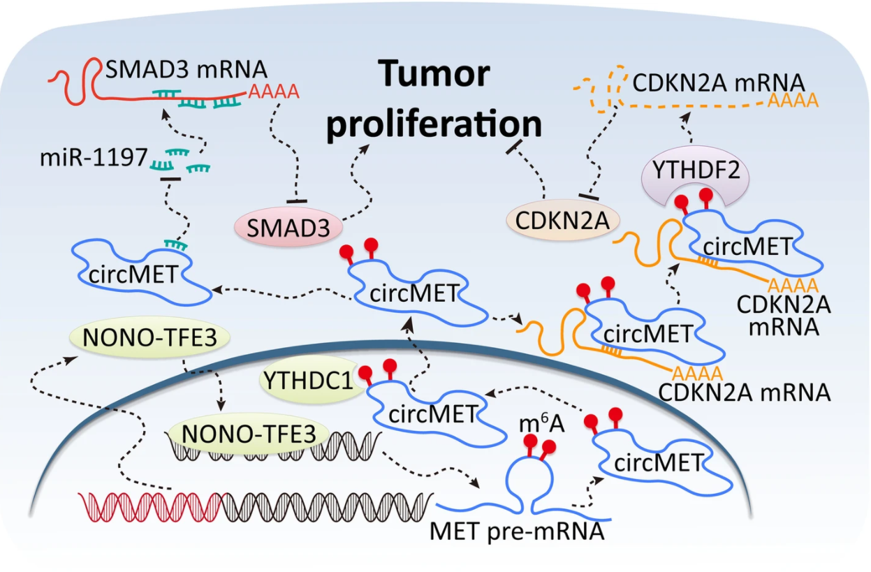 在肿瘤增殖过程中,circMET不仅可以通过充当miRNAs的“吸附剂”调控SMAD3的表达,还可以通过直接与mRNA结合调控CDKN2A mRNA的稳定性。circMET通过与CDKN2A mRNA 3’非翻译端直接结合,并且募集m6A阅读蛋白YTHDF2调控CDKN2A mRNA的降解。有趣的现象是,circMET募集YTHDF2CDKN2A mRNA的过程中,YTHDF2直接结合在circMETm6A修饰位点,并参与CDKN2A mRNA的降解过程,而YTHDF2并未直接结合CDKN2A mRNA上的m6A修饰位点。