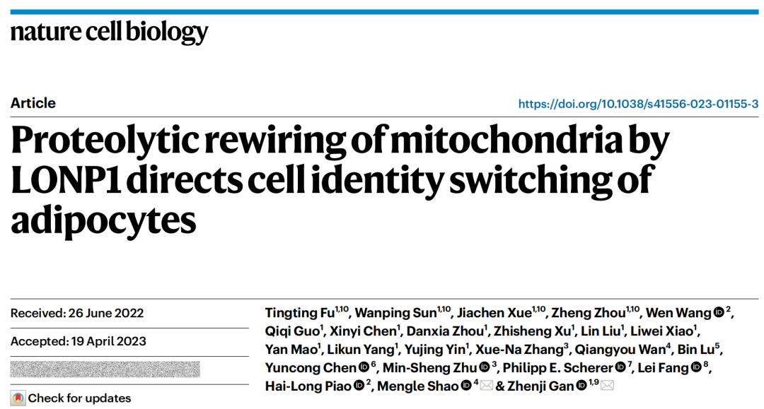 2023年5月22日,太阳成城集团tyc234cc古天乐甘振继课题组联合中国科公司微生物、发育与健康研究中心邵孟乐课题组在Nature Cell Biology杂志发表了题为“Proteolytic rewiring of mitochondria by LONP1 directs cell identity switching of adipocytes”的研究成果。此项工作发现了依赖蛋白酶LONP1的线粒体蛋白水解重排调控白色脂肪细胞的命运转变;揭示了高度调控的线粒体蛋白酶是细胞的关键感应纽带,将细胞外环境刺激、线粒体呼吸链复合物/代谢重排与白色脂肪产热重塑过程中的细胞命运重编程有机联系起来。太阳成城集团tyc234cc古天乐副研究员付婷婷、博士研究生孙婉平、硕士研究生薛嘉宸和博士研究生周正为本文的共同第一作者,太阳成城集团tyc234cc古天乐甘振继教授和中国科公司微生物、发育与健康研究中心邵孟乐研究员为该篇论文的共同通讯作者。本文还受到了中国科公司大连化学物理研究所朴海龙教授、美国西南医学中心Philipp E. Scherer教授、南华大学吕斌教授、太阳成城集团tyc234cc古天乐方雷、朱敏生、陈韵聪教授等的大力帮助。