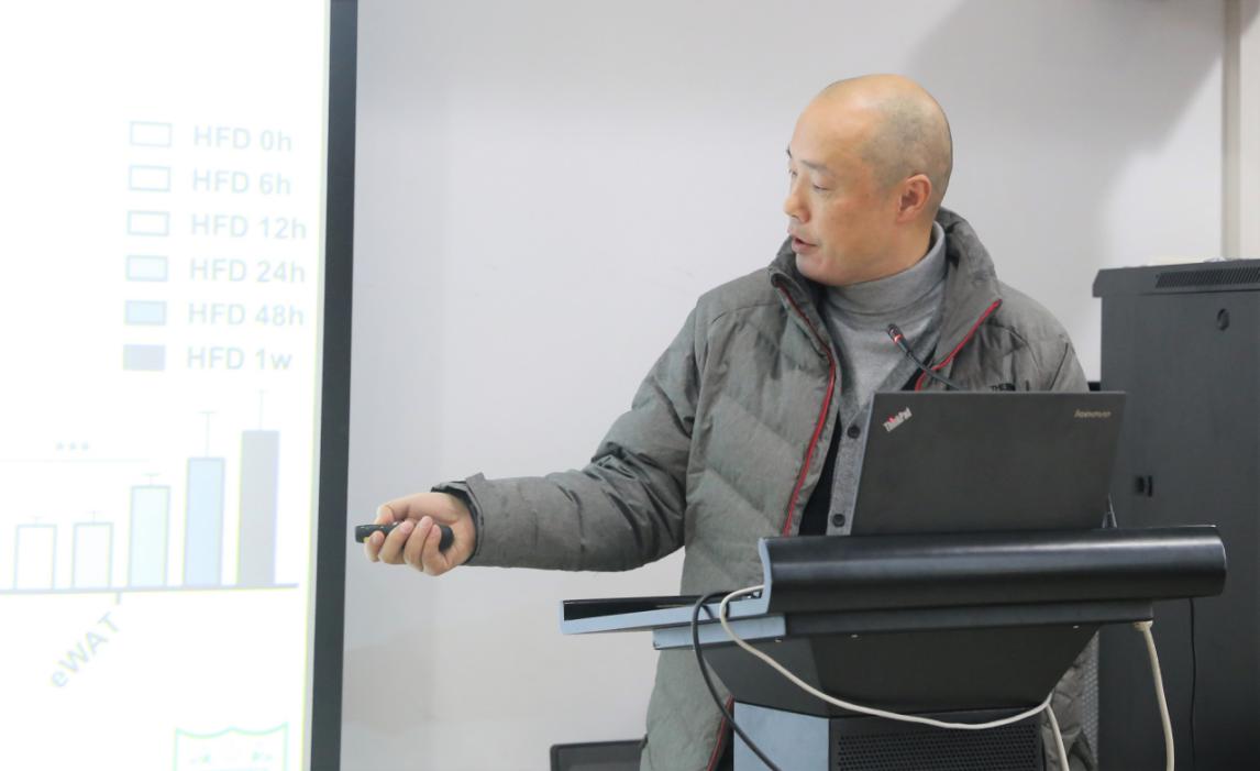 李朝军教授代表赵越老师介绍了她的研究课题《Liver responses to nutrition overloading and remodels adipose lipid deposition through hepatocytes-derived exosomal miRNAs Let-7p-5e》(营养过度时肝脏通过肝细胞衍生的外泌体miRNA Let-7p-5e重塑脂肪组织的脂质积累)。赵越老师研究发现:肝脏是小鼠对高脂饮食反应的首个器官;高脂饮食后,肝细胞可通过分泌外泌体重塑脂肪细胞,其中的Let-7e-5p能够直接靶向Pgc1α介导肝脏驱动的白色脂肪组织的重构。