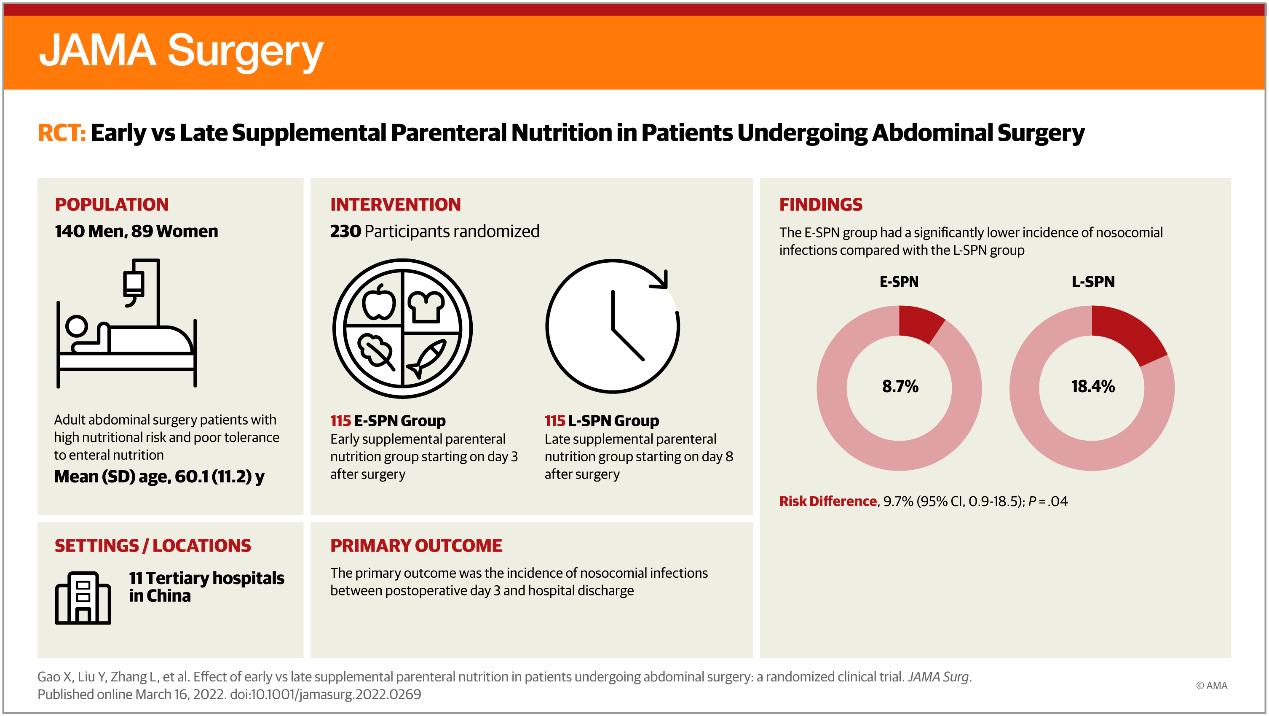2022年3月16日,太阳成城集团tyc234cc古天乐附属金陵医院(东部战区总医院)普通外科王新颖教授团队在国际外科学顶级期刊《JAMA Surgery》(美国医学会杂志外科学,影响因子14.8分)杂志,在线发表题为《Effect of Early vs Late Supplemental Parenteral Nutrition in Patients Undergoing Abdominal Surgery: A Randomized Clinical Trial》一项重大临床研究成果。《JAMA Surgery》创刊于1920年,是医学四大期刊之一《JAMA》美国医学会杂志的系列成员。本研究是国际上第一个探讨腹部外科病人术后补充性肠外营养应用时机的多中心临床随机研究,也是中国学者在《JAMA Surgery》上发表的首篇外科营养领域的多中心临床研究。