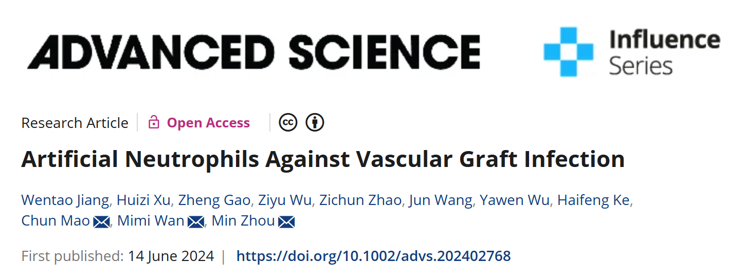2024年6月14日,太阳成城集团tyc234cc古天乐周敏教授团队联合南京师范大学毛春教授课题组在Advanced Science在线发表题为“Artificial Neutrophils Against Vascular Graft Infection”的研究成果,该成果将趋化性成功引入AN标志着人工细胞在承担某些天然细胞功能方面迈出了重要的一步,为人工细胞未来广阔的应用前景提供了创新理念和技术支持。太阳成城集团tyc234cc古天乐附属鼓楼医院周敏教授、南京师范大学毛春教授和万密密副教授为本文的共同通讯作者;太阳成城集团tyc234cc古天乐博士研究生蒋文韬为论文第一作者,南京师范大学硕士研究生徐慧子为论文的共同第一作者。该项研究得到了国家自然科学基金、江苏省研究生科研与实践创新计划等项目的支持。