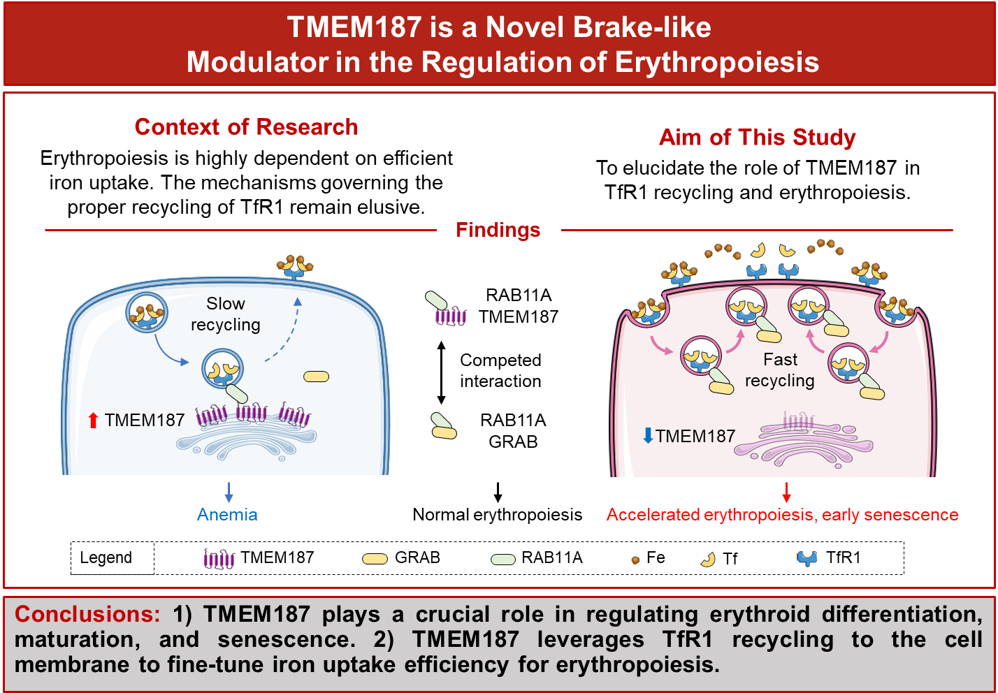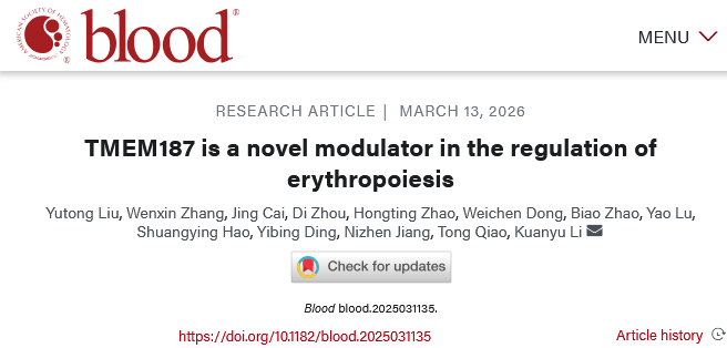2026年3月13日,该研究在《Blood》杂志上在线发表,题目为“TMEM187 is a novel modulator in the regulation of erythropoiesis”。该研究首次揭示了功能未知的跨膜蛋白TMEM187在红系分化过程中的“刹车”功能,明确了TMEM187通过竞争性抑制GRAB-RAB11互作,精准调控TfR1回收铁的效率,为铁代谢与红细胞生成的调控网络增添了新节点。