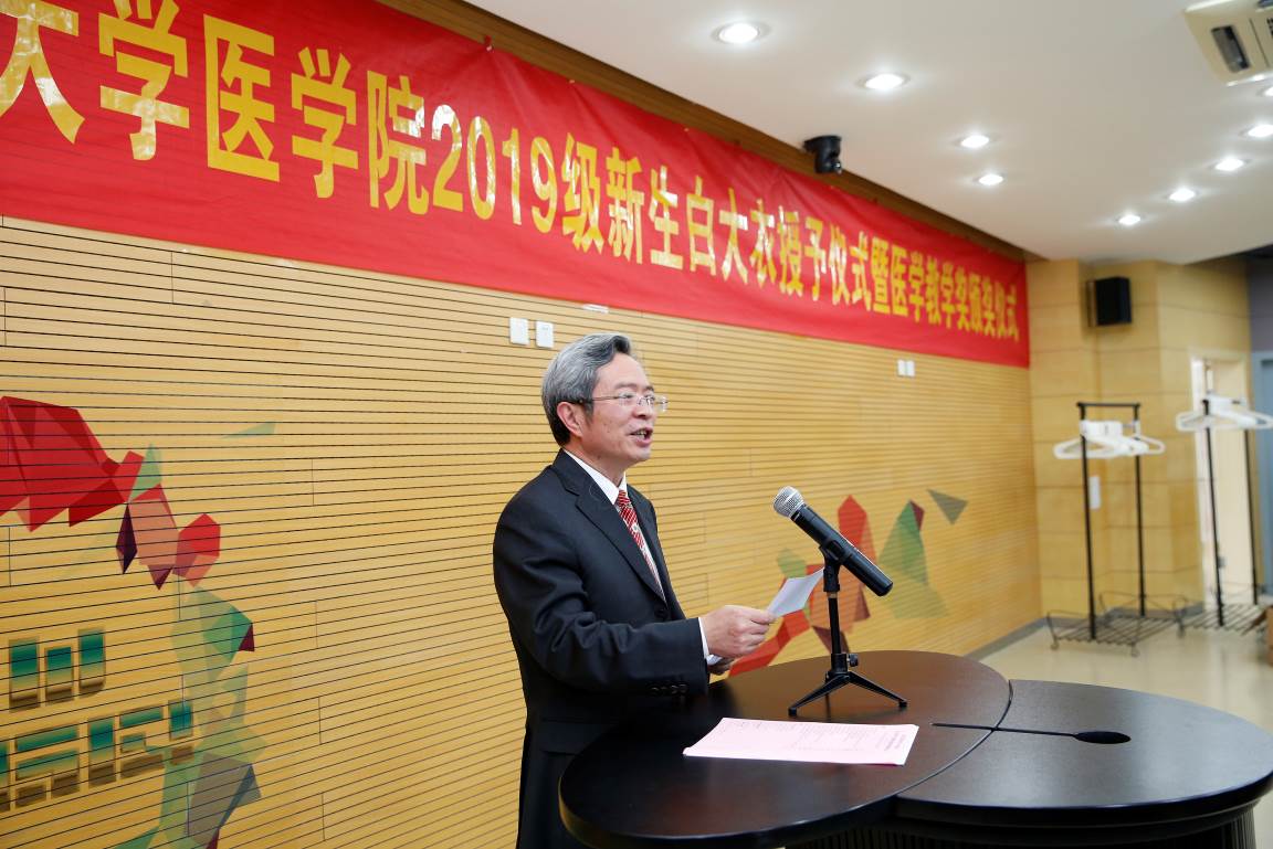 授予仪式后,太阳成城集团tyc234cc古天乐党委常务副书记杨忠致辞。他首先对新生表示祝贺,接过白大衣意味着新的起点,白大衣授予仪式是标志同学们步入老员工活的又一次成人礼。他同时指出,医学问道过程中也许会遭遇挫折、历经失败,在治病救人道路上会遭受误解,直面危险。然而,临危不惧、义无反顾、勇往直前、无怨无悔才是新时代医员工的标签。他寄语新生:涵养国家情怀,把握时代历史发展方向和时代脉搏,在服务国家和人民的过程中成就自己;培养大爱之心,融合人文情怀,积淀文化底蕴;注重知行合一,实践理论并重,真正实现医者仁心。