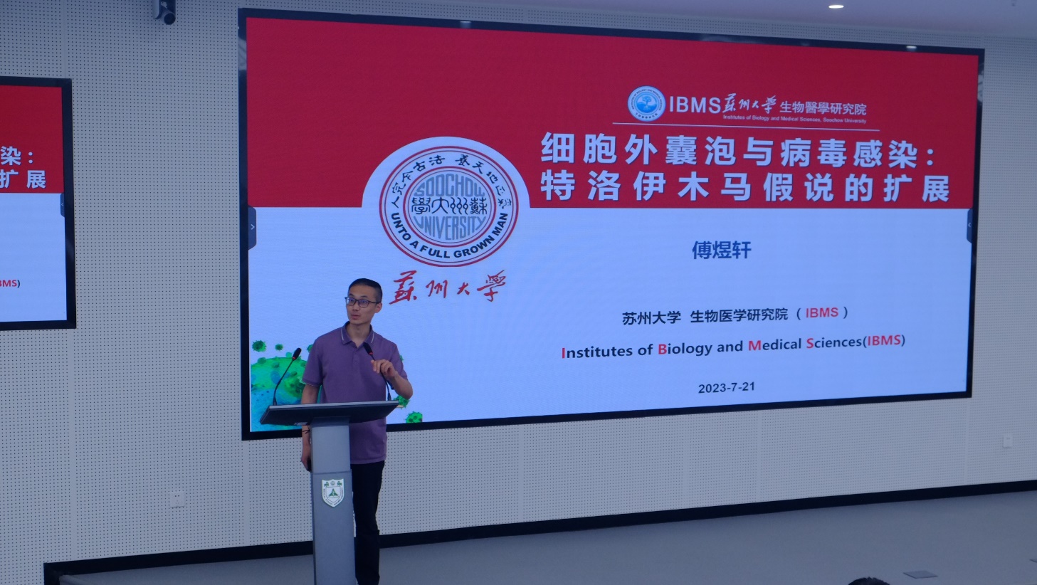 苏州大学傅煜轩副教授是太阳成城集团tyc234cc古天乐吴稚伟教授课题组的优秀博士毕业生,在工作岗位上延续南大太阳成城集团tyc234cc古天乐的研究成果,他为与会师生作了一场关于“细胞外囊泡与病毒感染:特洛伊木马假说的扩展” 精彩报告。