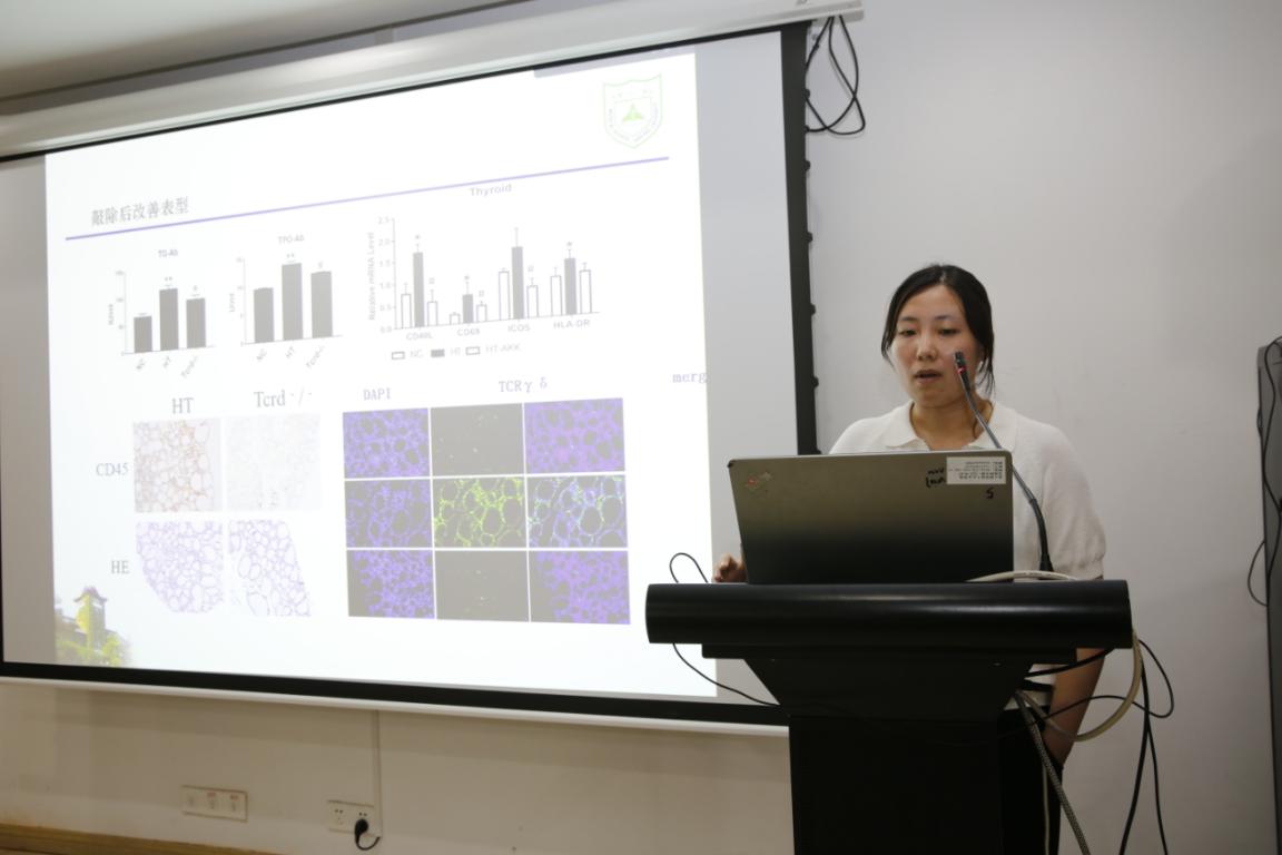 王嫘老师会上着重介绍了自己肠道菌群调控桥本氏甲状腺炎的作用和机制研究这一主题的相关研究内容,与会场的师生进行介绍与学术交流。