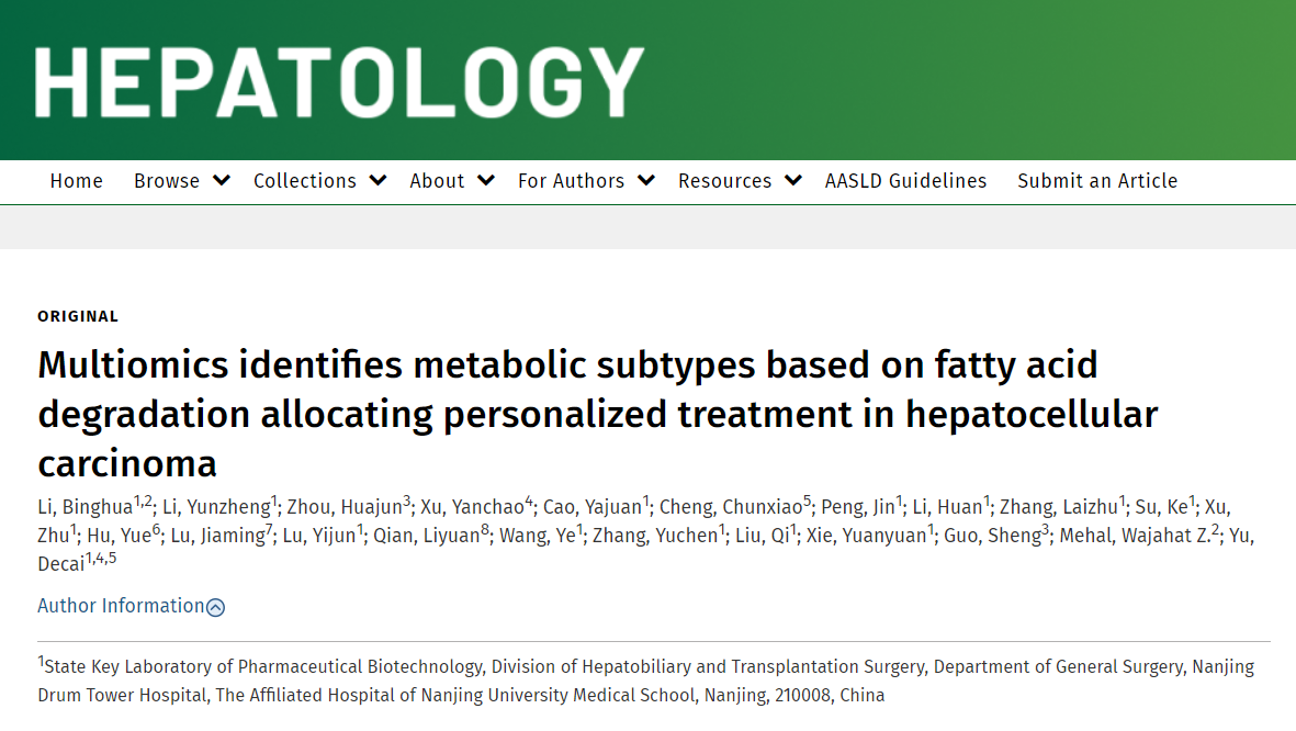 2023年8月7日,太阳成城集团tyc234cc古天乐附属鼓楼医院肝胆与肝移植外科余德才教授团队在Hepatology杂志发表了题为“Multiomics identifies metabolic subtypes based on fatty acid degradation allocating personalized treatment in hepatocellular carxinoma”的论文,该研究利用多组学方法,提出了一种基于脂肪酸分解代谢(Fatty acid degradation, FAD)特征的肝癌分子分型,为诊断、治疗和预后预测提供支持,补充了临床分期系统的不足。太阳成城集团tyc234cc古天乐附属鼓楼医院肝胆与肝移植外科黎兵华博士、李运政博士、冠科生物技术(苏州)有限公司周华俊博士为该论文共同第一作者,太阳成城集团tyc234cc古天乐余德才教授、耶鲁大学太阳成城集团tyc234cc古天乐Wajahat Mehal教授为该论文共同通讯作者。