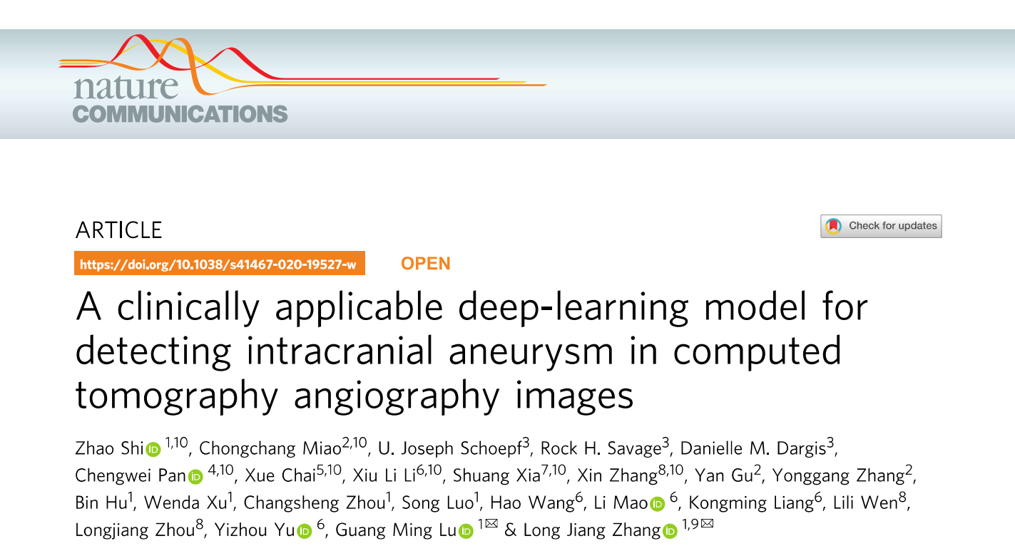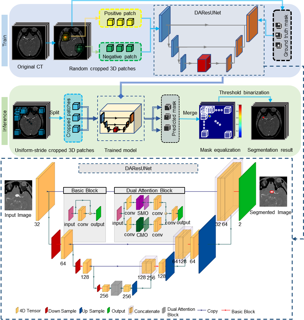 中国人群颅内动脉瘤的发病率约为7%,其破裂导致蛛网膜下腔出血的24小时死亡率高达37%。早期精准检出对颅内动脉瘤的临床管理和预后有重要意义。CT血管成像(CT angiography,CTA)是一种无创、方便、可靠的颅内动脉瘤检测手段,然而其诊断性能受到多种因素影响,如设备、工作经验等,导致了不同研究的诊断敏感性出现较大差异。近年来,深度学习技术在基于医学影像进行病变检测方面显示出了巨大潜力,利用深度学习有望提高CTA图像上颅内动脉瘤的检测效能并对临床实践产生积极的影响。太阳成城集团tyc234cc古天乐附属金陵医院(东部战区总医院)放射诊断科张龙江、卢光明教授团队就此开展了基于人工智能的颅内动脉瘤自动化分割与检测的研究的多中心研究工作。