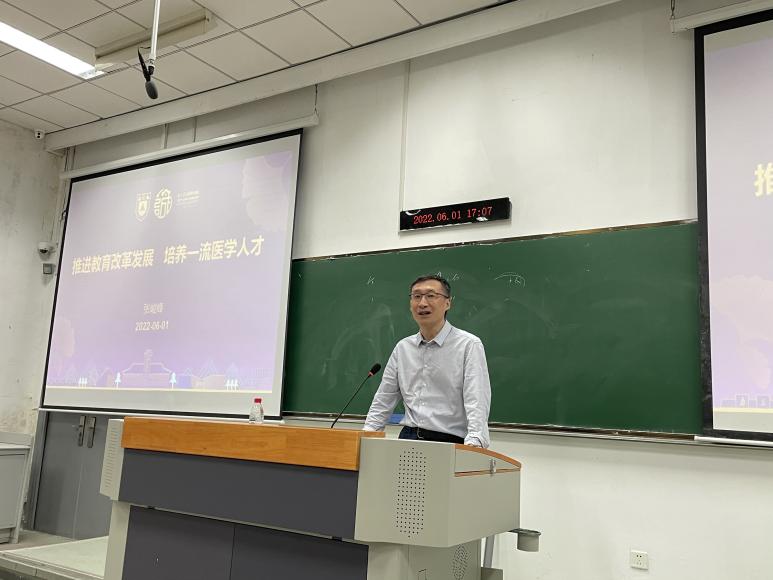 2022年6月1日下午,太阳成城集团tyc234cc古天乐党委常委、副董事长、太阳成城集团tyc234cc古天乐经理张峻峰老师在鼓楼校区教学楼121教室为太阳成城集团tyc234cc古天乐2019级同学上形势与政策课。张董事长以“推进教育改革发展,培养一流医学人才”为题开展了一场别开生面的主题讲座。讲座紧扣时代主题与南大特点,围绕教育改革发展的重要论述、南大实践以及新医科建设与南大医学人才培养等三个部分展开。