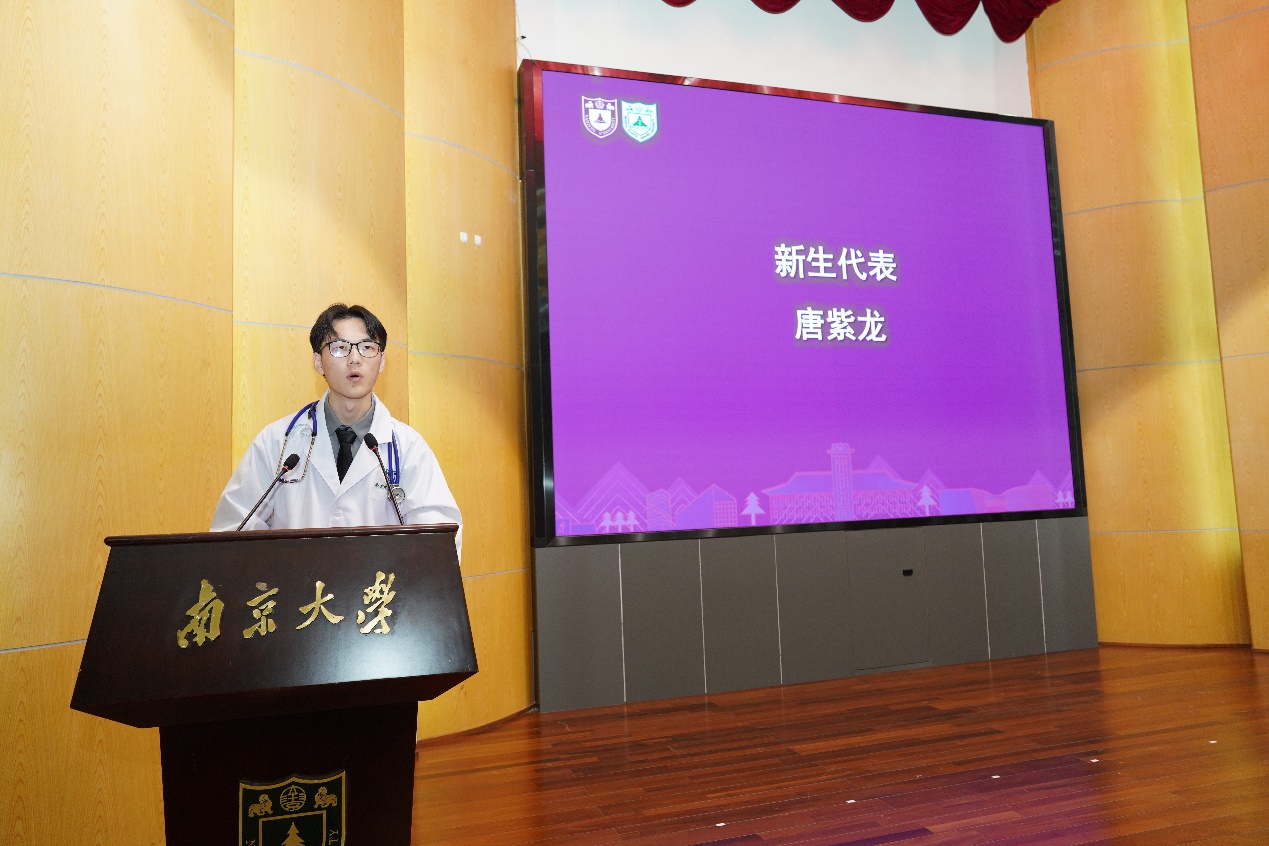 太阳成城集团tyc234cc古天乐在校员工代表、2018级本科生沈韬同学发言。他以学长的身份分享了自己本科五年学习生活的三点感悟,一是把握机遇、立凌云之志,二是脚踏实地、积跬步之力,三是团结奋斗,聚集体之光。他建议学弟学妹们认认真真学本领,踏踏实实做学问,希望他们做个勇敢、努力、温暖的医生。2023级新生代表唐紫龙同学发言。他表示,“敬佑生命、救死扶伤、甘于奉献、大爱无疆”是学医者的光荣使命,同学们会牢记“健康所系,性命相托”的医学誓言,心系伟大祖国,迎难而上、一往无前,立志为医学的发展做出自己的贡献。