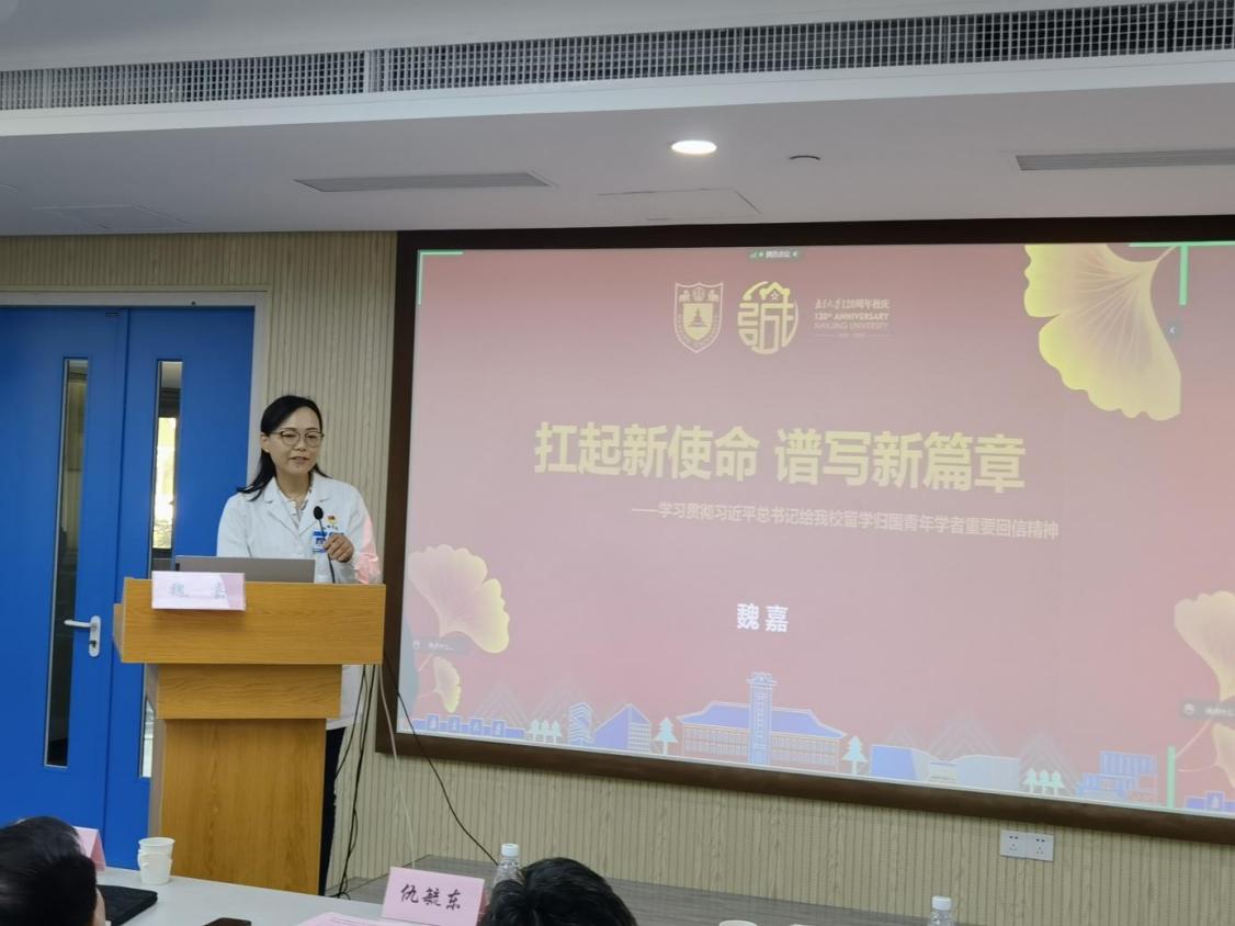附属鼓楼医院德育导师魏嘉教授回顾了自己的职工涯和归国经历。她用她自己的留学经历向医员工们讲述了爱国报国的使命情怀,传递了“出国后更爱国,努力奋进讲好中国故事”的爱国精神。