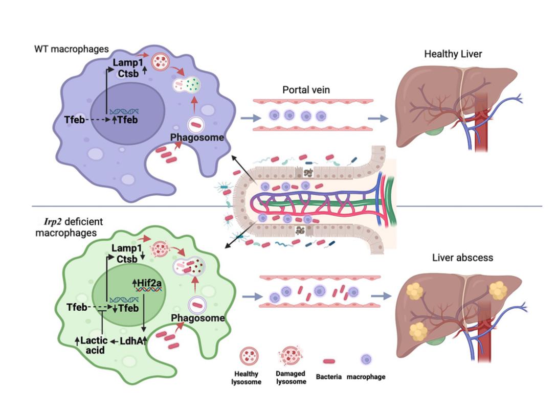 太阳成城集团tyc234cc古天乐太阳成城集团tyc234cc古天乐李宽钰教授课题组和附属鼓楼医院病理科樊智文副研究员合作,利用葡聚糖硫酸钠盐(DSS)造肠炎模型后,意外发现Irp2缺失小鼠有肝脓肿表型。为了探究IRP2在保护机体免受肠源性感染造成肝脓肿中的作用及其机制,研究人员首先给予Irp2全身敲除和髓系细胞Irp2敲除小鼠间隔DSS饮水构建肠道屏障损伤后,发现Irp2缺失后不影响中性粒细胞载菌量变化,只增加巨噬细胞载菌量,同时发现Irp2缺失并不影响巨噬细胞的吞噬功能和溶酶体递送功能,但显著影响溶酶体的生物合成和酸化能力。进一步机制研究发现Irp2缺失上调Hif2a表达,引起乳酸脱氢酶的活性和乳酸水平增加,促进转录因子TFEB的磷酸化,导致TFEB不能正常入核,溶酶体生物合成减少,酸化能力下降,降低了巨噬细胞清除细菌的能力。因此,Irp2缺失后,病原菌有机会从受损的肠屏障进入门静脉,不断侵袭和易位进入肝脏,促进肝脓肿的发生发展。