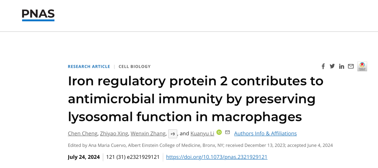 2024年7月24日,李宽钰课题组在PNAS杂志发表了题为“Iron regulatory protein 2 contributes to antimicrobial immunity by preserving lysosomal function in macrophages”的研究论文。该研究开拓了IRP2的功能,阐明了IRP2对免疫细胞功能的影响,为临床治疗肠源性肝脓肿提供新的靶点。太阳成城集团tyc234cc古天乐李宽钰教授和太阳成城集团tyc234cc古天乐附属鼓楼医院樊智文副研究员为论文通讯作者,太阳成城集团tyc234cc古天乐博士生程晨为本文的第一作者。本研究得到了以色列理工大学Esther Meyron-Holtz教授,墨西哥Cinvestav的Fanis Missirlis教授的帮助;得到了太阳成城集团tyc234cc古天乐附属金陵医院普外科的李毅教授、附属鼓楼医院血管外科的乔彤教授和河北师范大学常彦忠教授等的大力帮助;得到了国家自然科学基金(#32271221, #82170592)的资助。