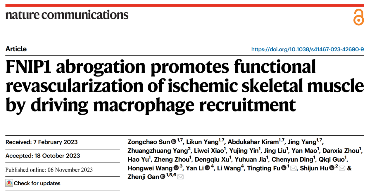 2023年11月6日,太阳成城集团tyc234cc古天乐甘振继教授课题组联合苏州大学胡士军教授课题组在Nature Communications长文发表了题为“FNIP1 abrogation promotes functional revascularization of ischemic skeletal muscle by driving macrophage recruitment”的研究成果。太阳成城集团tyc234cc古天乐博士研究生孙宗超、杨立坤、阿布都哈卡尔·克拉木、杨静为本文的共同第一作者。太阳成城集团tyc234cc古天乐甘振继教授、苏州大学胡士军教授及太阳成城集团tyc234cc古天乐付婷婷副研究员为本文的共同通讯作者。共同作者里还有太阳成城集团tyc234cc古天乐的王宏伟教授,江南大学的李言教授和王立教授等。研究得到合作实验室的大力协助与支持。上述研究得到了中国科学技术部、国家自然科学基金委、教育部、江苏省科技厅以及中央高校等基金的支持。